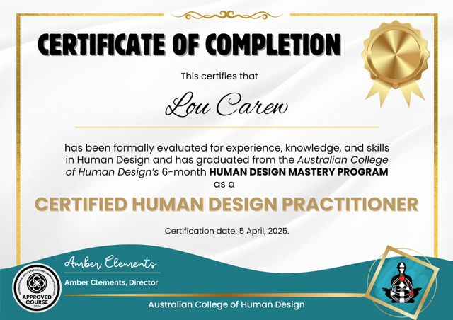 Certificate of Completion awarded to Lou Caren for completing the Australian College of Human Design's 6-month Human Design Mastery Program, signed by Amber Clements, Director, and issued on April 5, 2025.